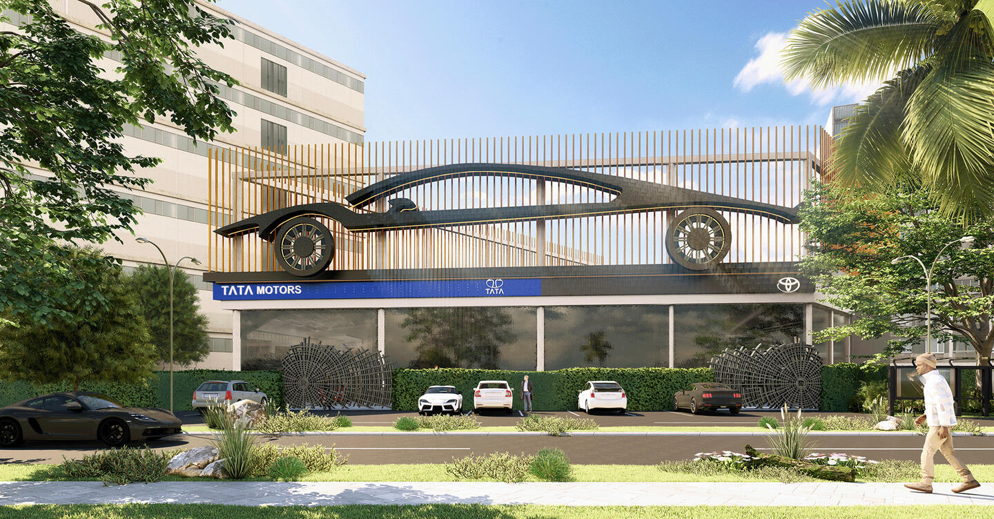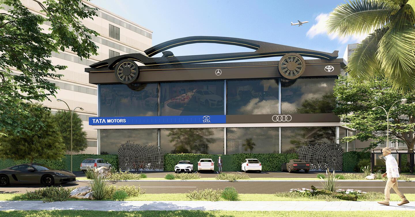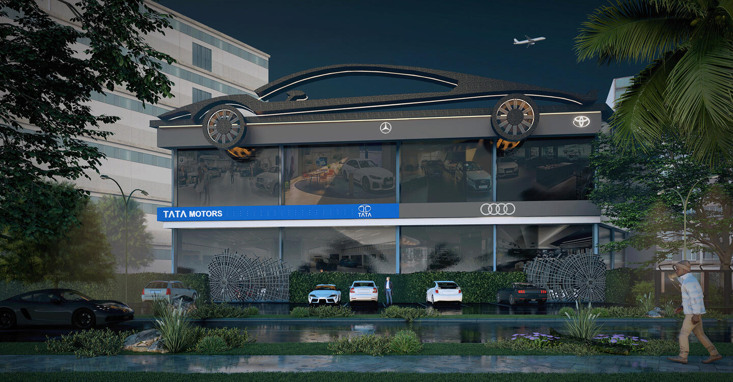 Design project for a Car showroom with a interesting structure and visibility challenge. Proposal included a 2D car on the rooftop to highlight the showroom on a busy road.